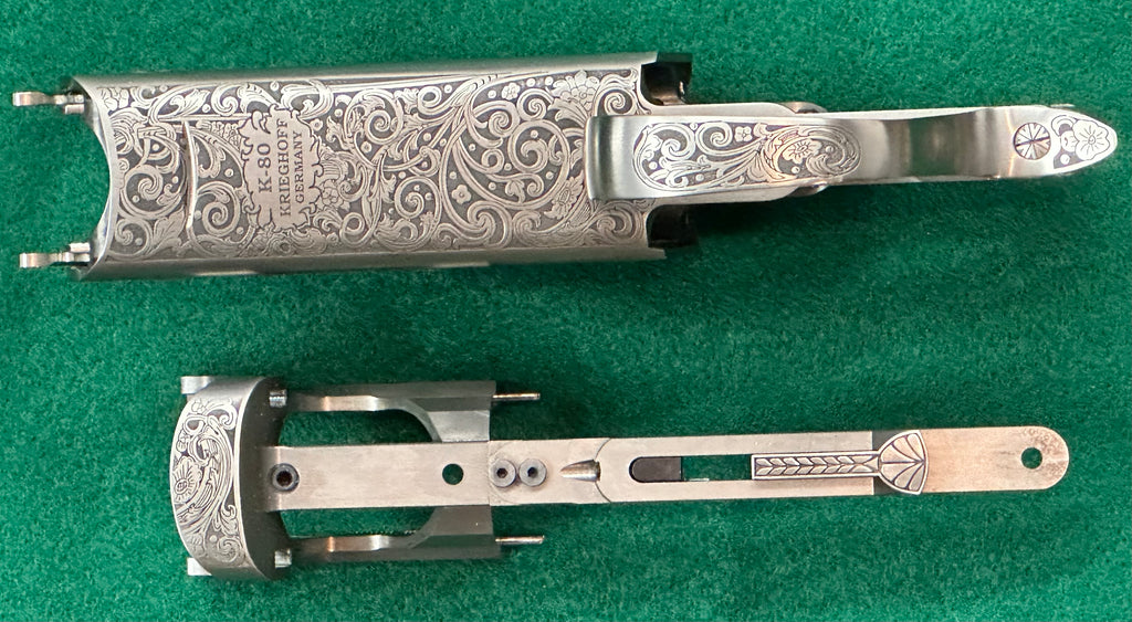 Selling this Krieghoff K80 Harmony scroll receiver and iron set. This is highly sought after nicely upgraded engraving pattern receiver.