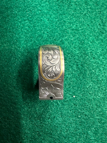 Engraved Krieghoff K80 #6 barrel hanger for choke tube barrels featuring a broken gold clay, scroll and gold line boarder.