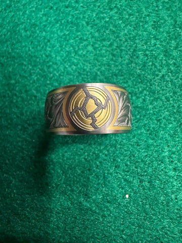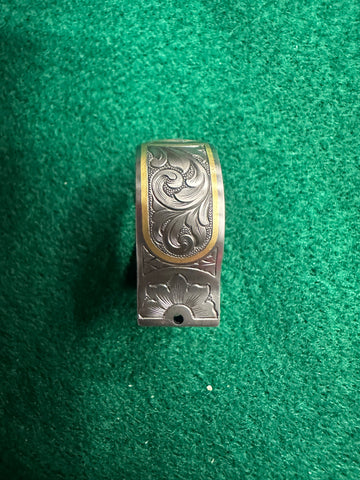 Engraved Krieghoff K80 #5 barrel hanger for choke tube barrels featuring a broken gold clay, scroll and gold line boarder.