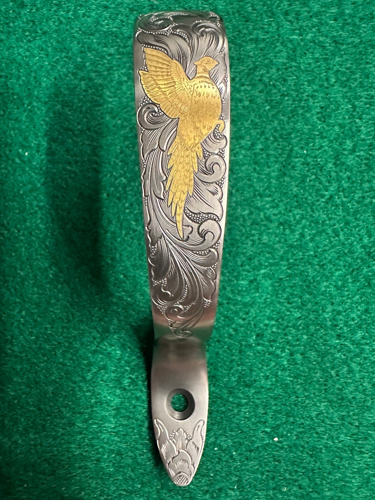 Engraved Krieghoff K80 trigger guard featuring a gold pheasant and scroll. This trigger guard has been nitride hardened.