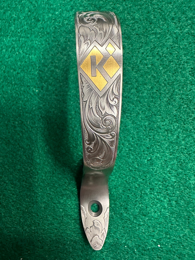 Engraved Krieghoff K80 trigger guard featuring a gold Krieghoff logo and additional scroll. This trigger guard has been nitride hardened.