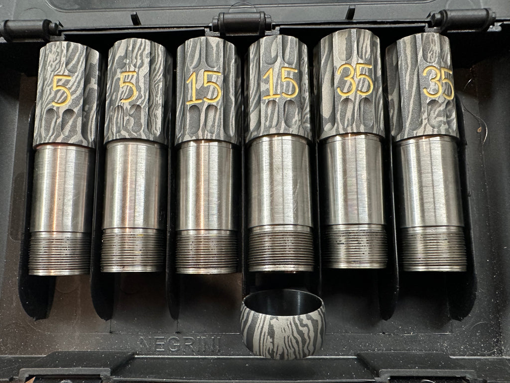 This is a set of Extreme titanium chokes with a custom grey tiger stripe finish. There is also a matching #5 barrel hanger to go along with these if desired but price does not include the hanger.