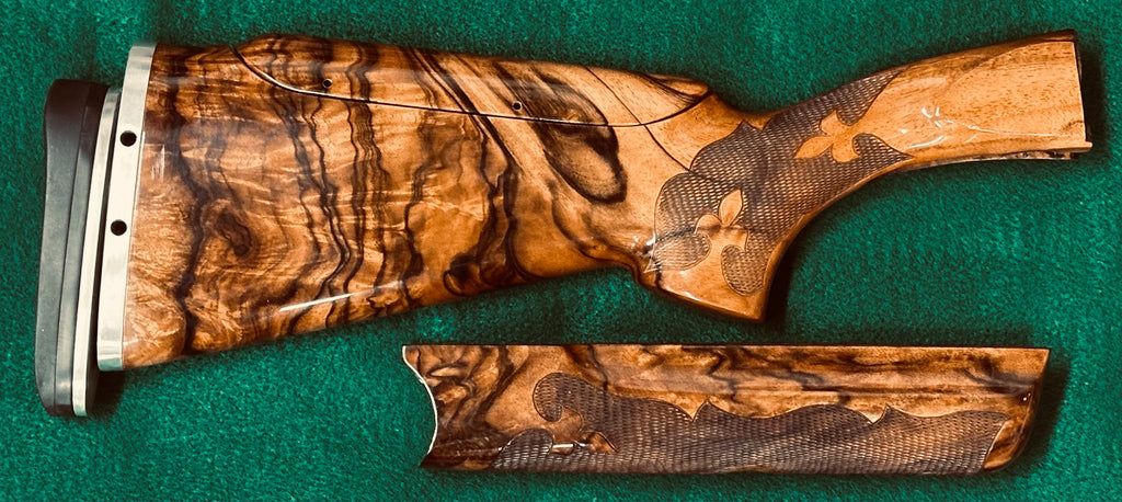 Krieghoff K80 #6 RH stock set. The stock is in excellent shape. Factory spec, 14 3/4” LOP to the end of the Graco unit. The measurement to the end of the wood is 13 5/8” if you wanted to take off the Graco and just put a pad on a 1” pad puts the LOP at 14 5/8” which is factory LOP.