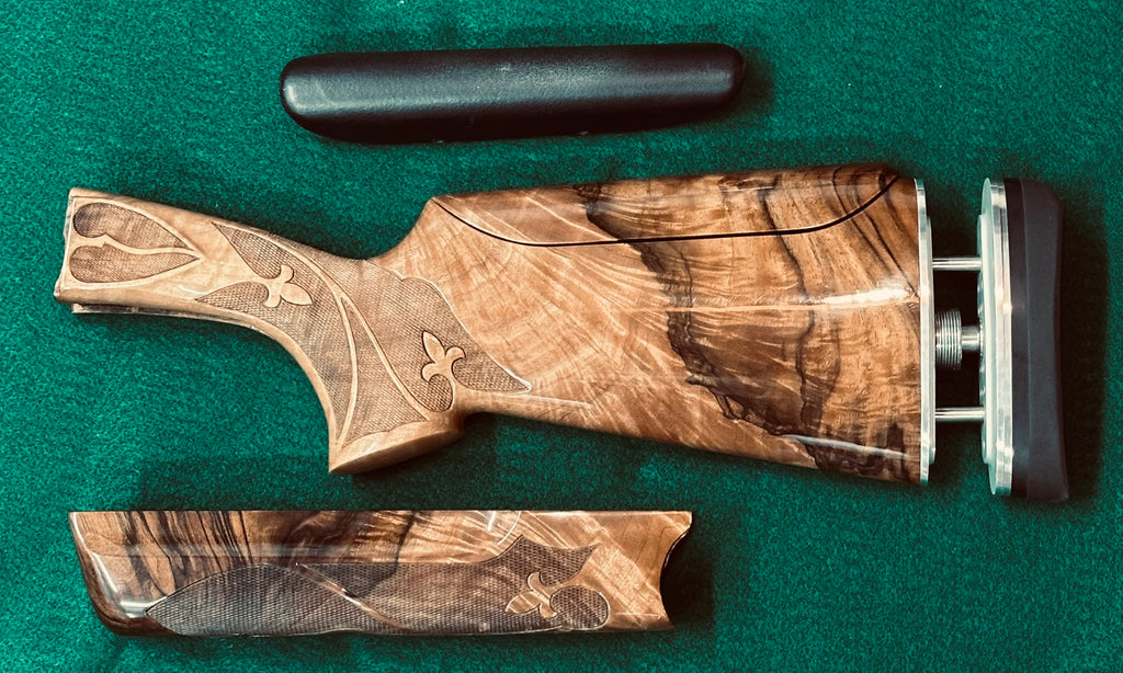 Krieghoff K80 stock for the Pro Sporter/ACS. The LOP is 14 3/8”. The gracoil is adjustable for length of pull and it also has an adjustable butt plate. This set was made by Tom Smith in Florida. There is also a soft comb that goes with it.