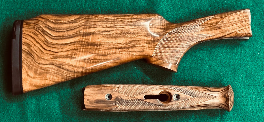 Krieghoff K80 sporting stock set, upgraded wood. Excellent new take off stock. LOP is 14 1/2”. The forearm is a satin finish.
